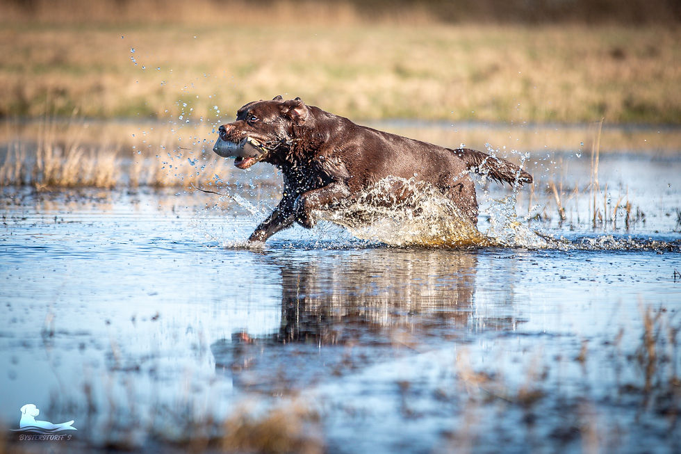 Prüfungen: Wesenstest, Formwert "Vorzüglich", JP/R (jagdliche Jugendprüfung für Retriever), BHP A+B (Begleithundprüfung)